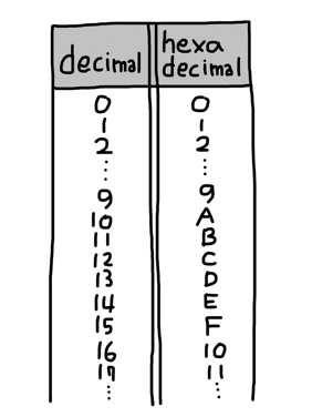 16진법은 한 자리에 16개(0 1 2 3 4 5 6 7 8 9 a b c d e f)의 문자를 사용한다.