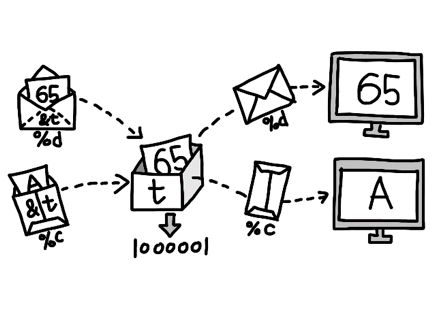 예를 들어 영문 대문자 "A"는 10진수 65를 의미하는 2진수 값으로 저장된다.