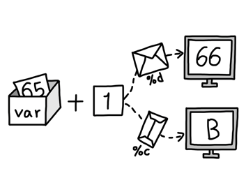 아스키문자표에서 'A'는 10진수 65로 저장되고 'B'는 10진수 66으로 저장된다.
